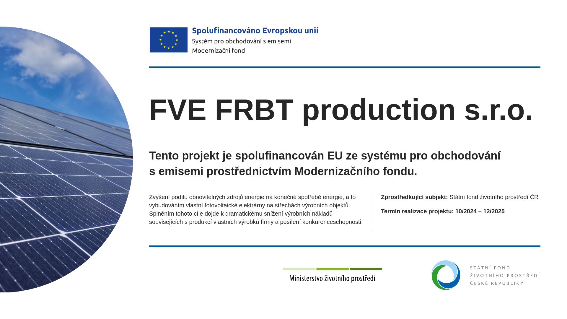 Projekt výstavby fotovoltaické elektrárny FVE Rousínov je realizován za finanční podpory z dotačního programu. Fotovoltaická elektrárna byla v prosinci 2025 připojena do distribuční sítě a jako dílo převzata od dodavatele. Cílem projektu je zvýšení energetické soběstačnosti společnosti a efektivnější využívání obnovitelných zdrojů energie.