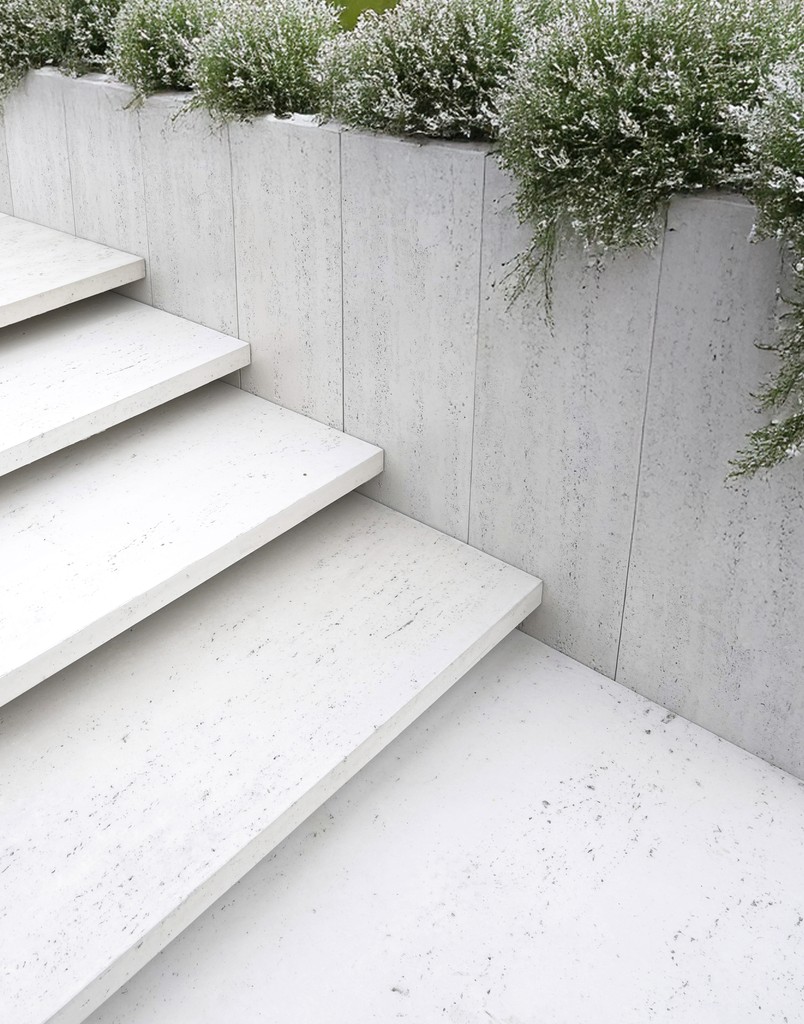 The Travertino paving brings tranquillity, lightness, and aesthetics in their purest form. Its slightly porous yet smooth-to-the-touch surface ensures not only pleasant barefoot walking but also a visual harmony with the surroundings. The large-format design visually expands the space and creates a sense of airiness, while the ivory-white shade adds freshness and nobility to the outdoor environment.