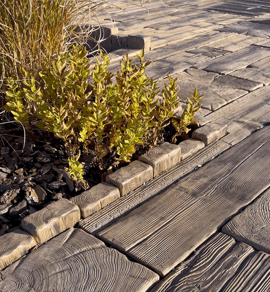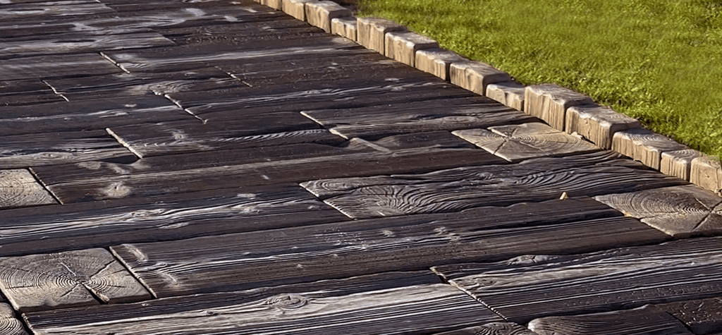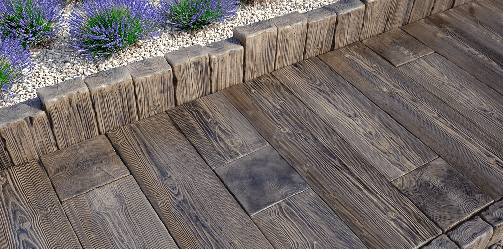 Edging and Grass Edges Stone Wood Achieve Perfection in Detail. Authentic imitation of old wood with subtle patina, cracked knots, and rustic texture ensures that even the walkway end or flower bed edge will not be ordinary. These concrete elements with a wood appearance harmonize perfectly with the Old Wood paving, creating a cohesive and stylistically unified outdoor space.