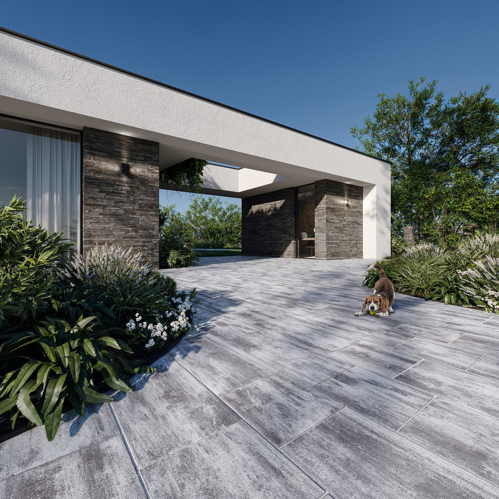 Valoria je dlažba, která do exteriéru vnáší lehkost, variabilitu a jemnou eleganci. Kombinace tří formátů – čtverce, menšího a většího obdélníku – umožňuje vytvářet hravé, ale přitom vyvážené skladby. Díky hladkým rovným hranám a decentní mikrofazetě působí moderně, čistě a zároveň velmi univerzálně.